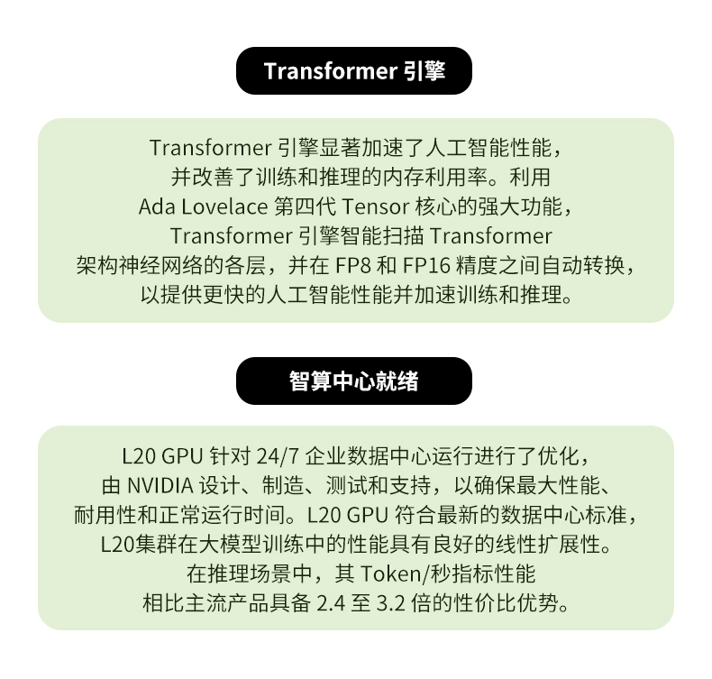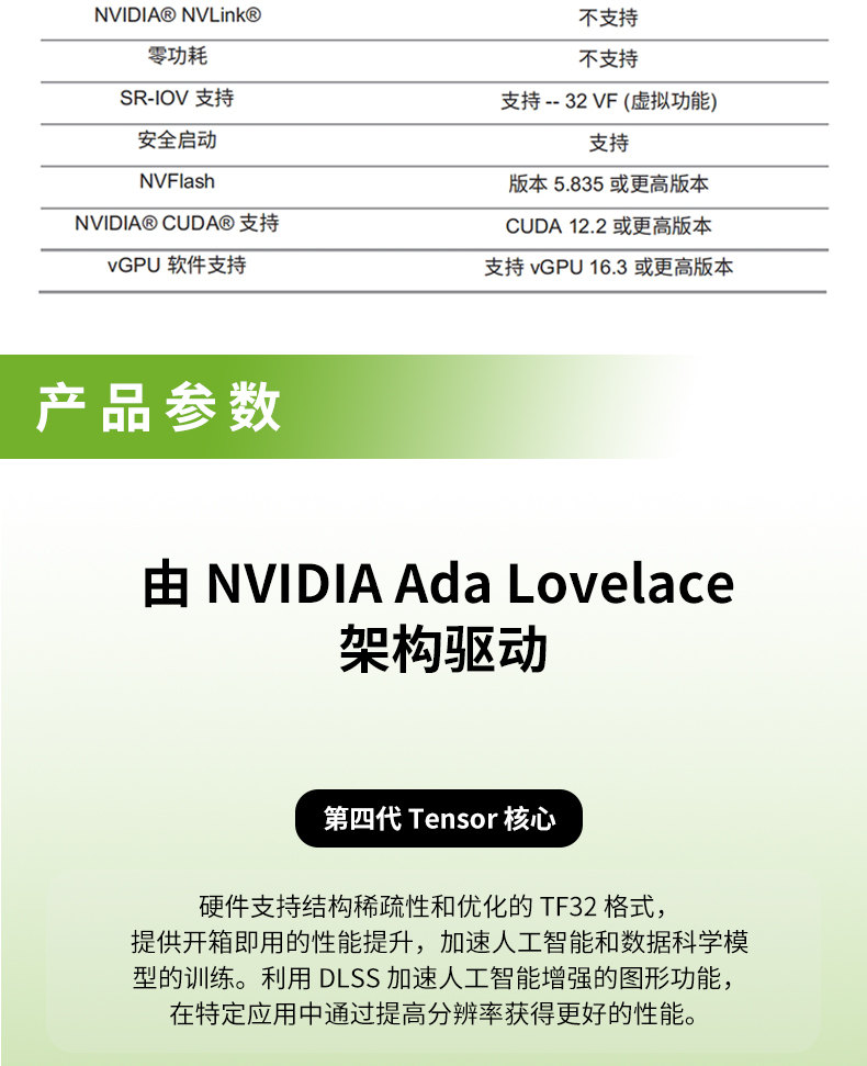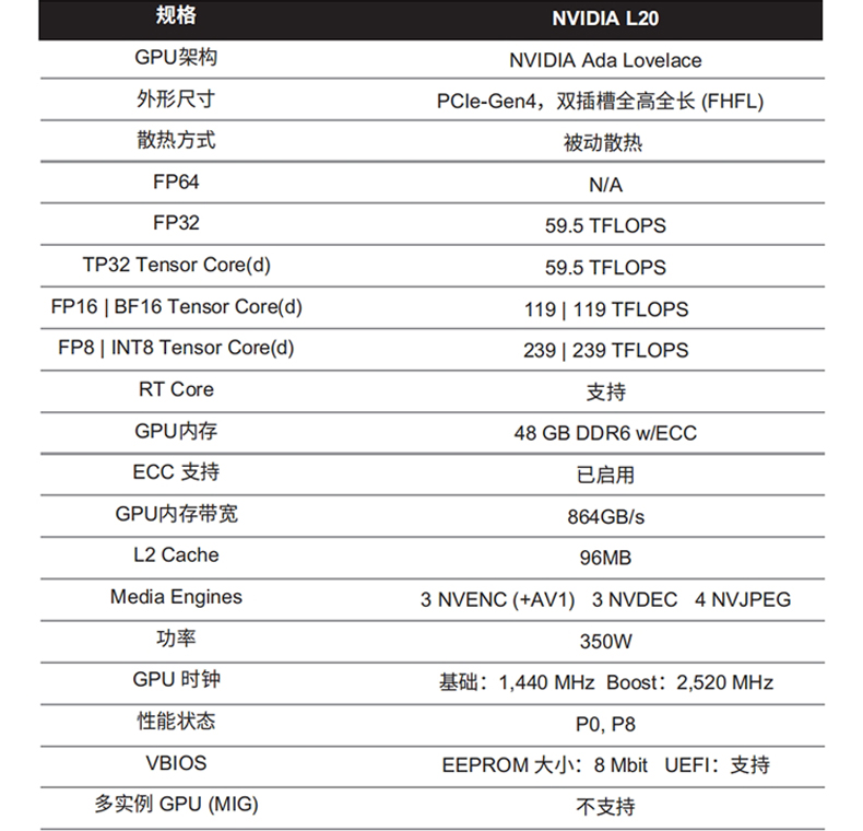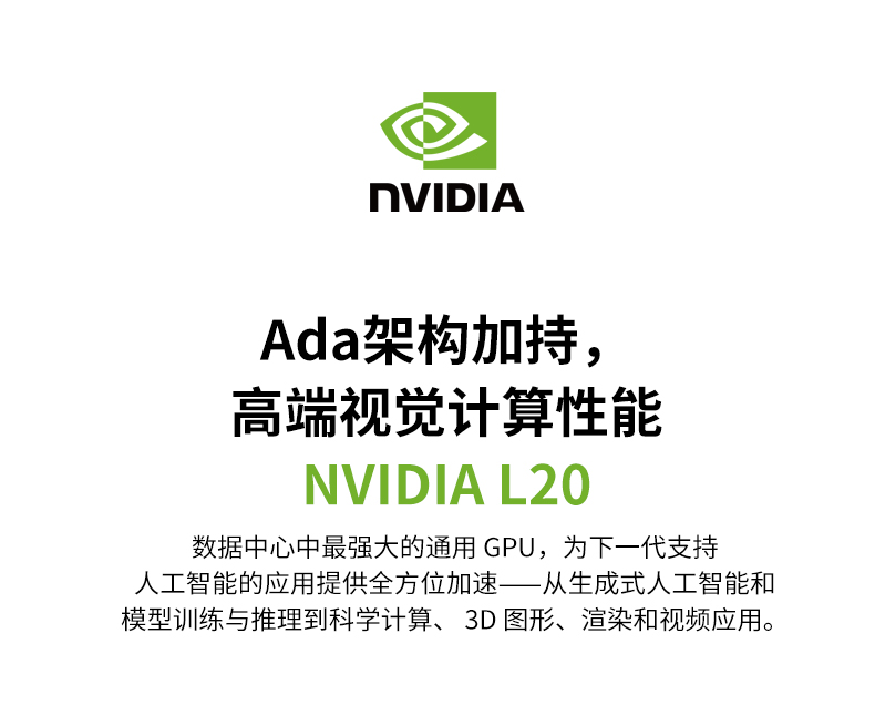 NVIDIA L20显卡 - 48GB GDDR6 显存,最大功耗 275瓦;PCI Express 4.0 x16;双槽全高全长,3年质保