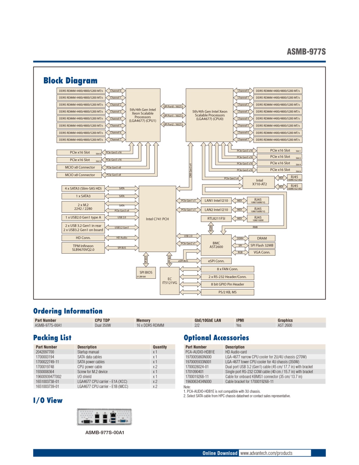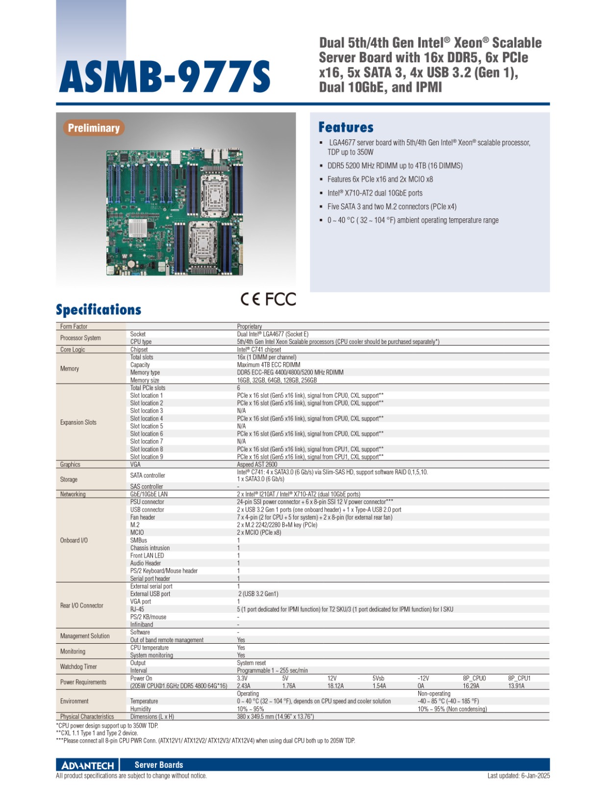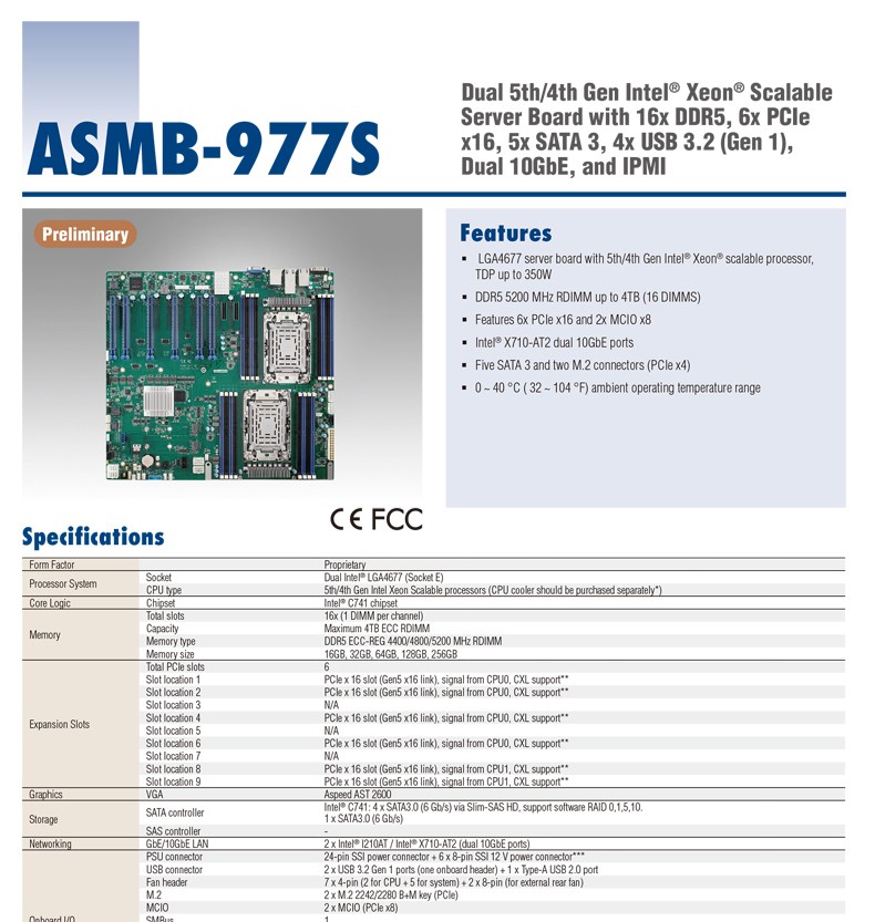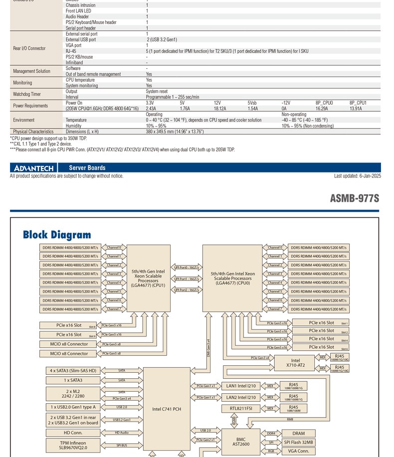 研华ASMB-977S 是一款双路 LGA4677 第四代 Intel® Xeon®可扩展服务器主板,采用intel C741 芯片组,具有Intel® X710-AT2 双10GbE 万兆以太网端口和 5个PCIe x16 Gen5.0 ,5x PCIe x8 Gen4.0 插槽。